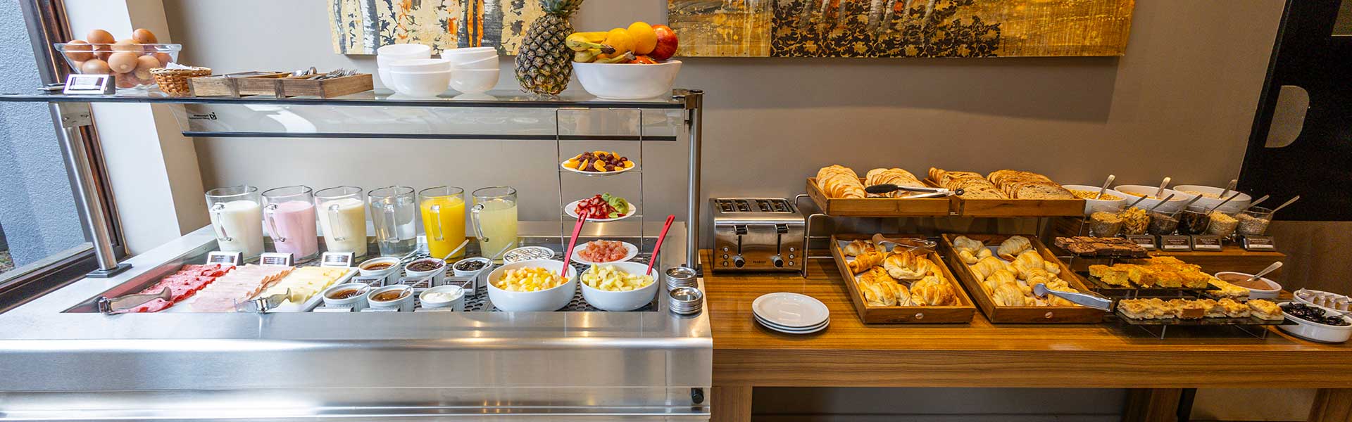 Jugos, té, café, leche, chocolate caliente, frutas, ensalada de frutas, fiambres y quesos, dulces regionales, dulce de leche, manteca, panes, tostadas, medialunas dulces y saladas, tortas, yogures, cereales.