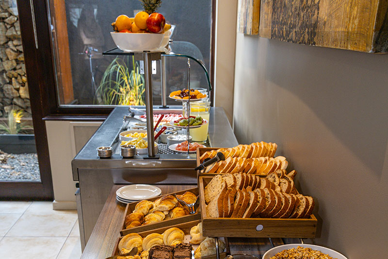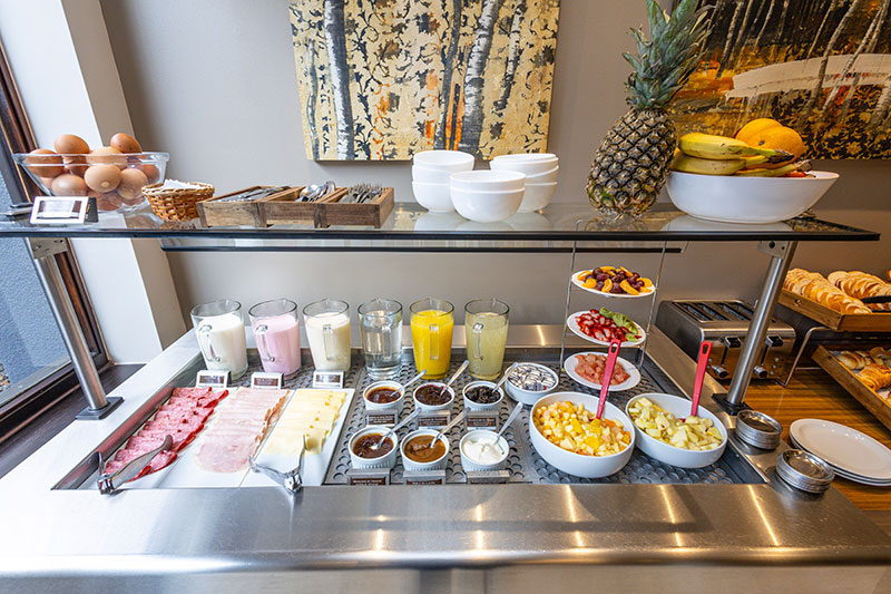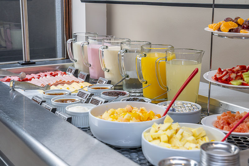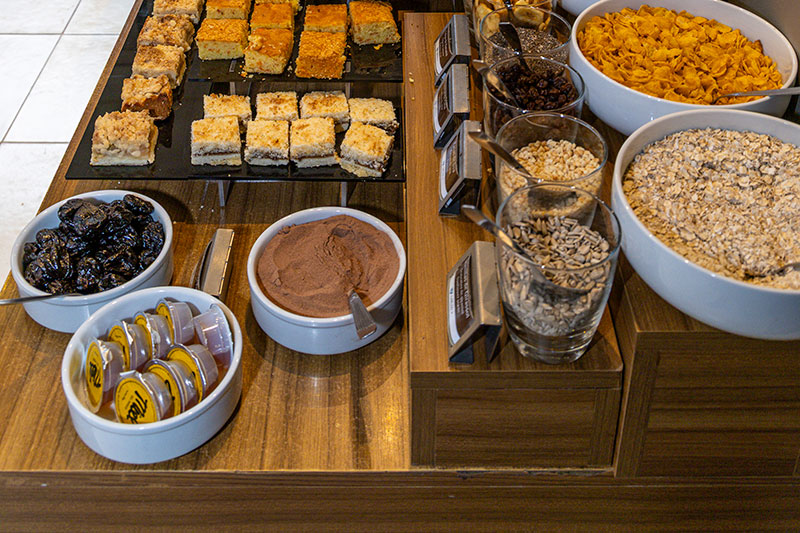 Sucos, chá, café, chocolate quente, frutas, salada de frutas, embutidos e queijos, doces regionais, doce de leite, manteiga, paes, tostadas, croissants doces e salgados, biscoitos, yogurts, cereais e ovos.